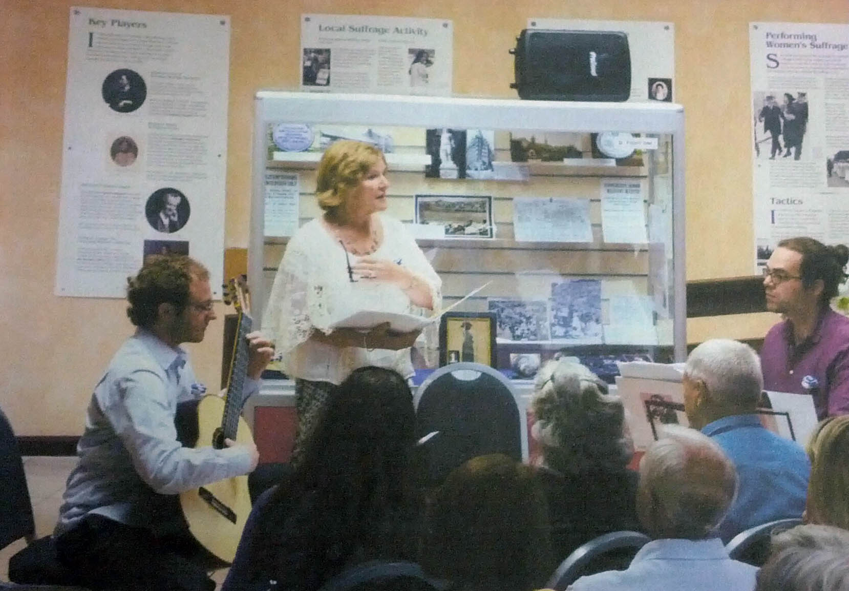 Audrey Ardern-Jones, reading Tattenham Corner at Bourne Hall at a special event, part of the 2013 ‘Dying for the Vote’ exhibition, curated by V. Irene Cockroft.