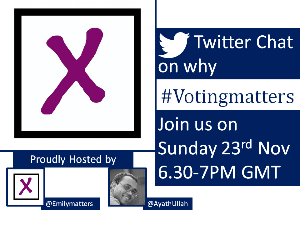 Please join our #votingmatters Twitter chat, co-hosted by @Emilymatters & @AyathUllah on: